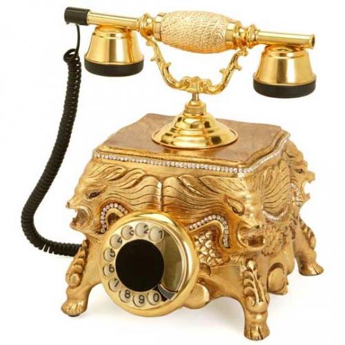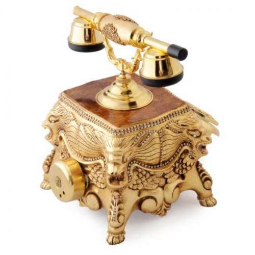 Ürün Hammadesi: Polyester Döküm Ürün Renk : Altın Garanti: 3 Yıl Makina Aksamı: Sıemens Tuş Takımı: Çevirmeli / Kolay Kullanımlı Zil Sesi : Çıngırak Ürün Menşei: Türk Malı Ürün Ölçüleri : 27 x 26 x30 cm Ürün yaprak varak çalışması olup kenarları swarovski taşlarla şık bir hale getirilmiştir. 4 köşesinde kükreyen aslan kafası motifi bulunan bu ürünümüz sınırlı sayıda üretilmiştir.